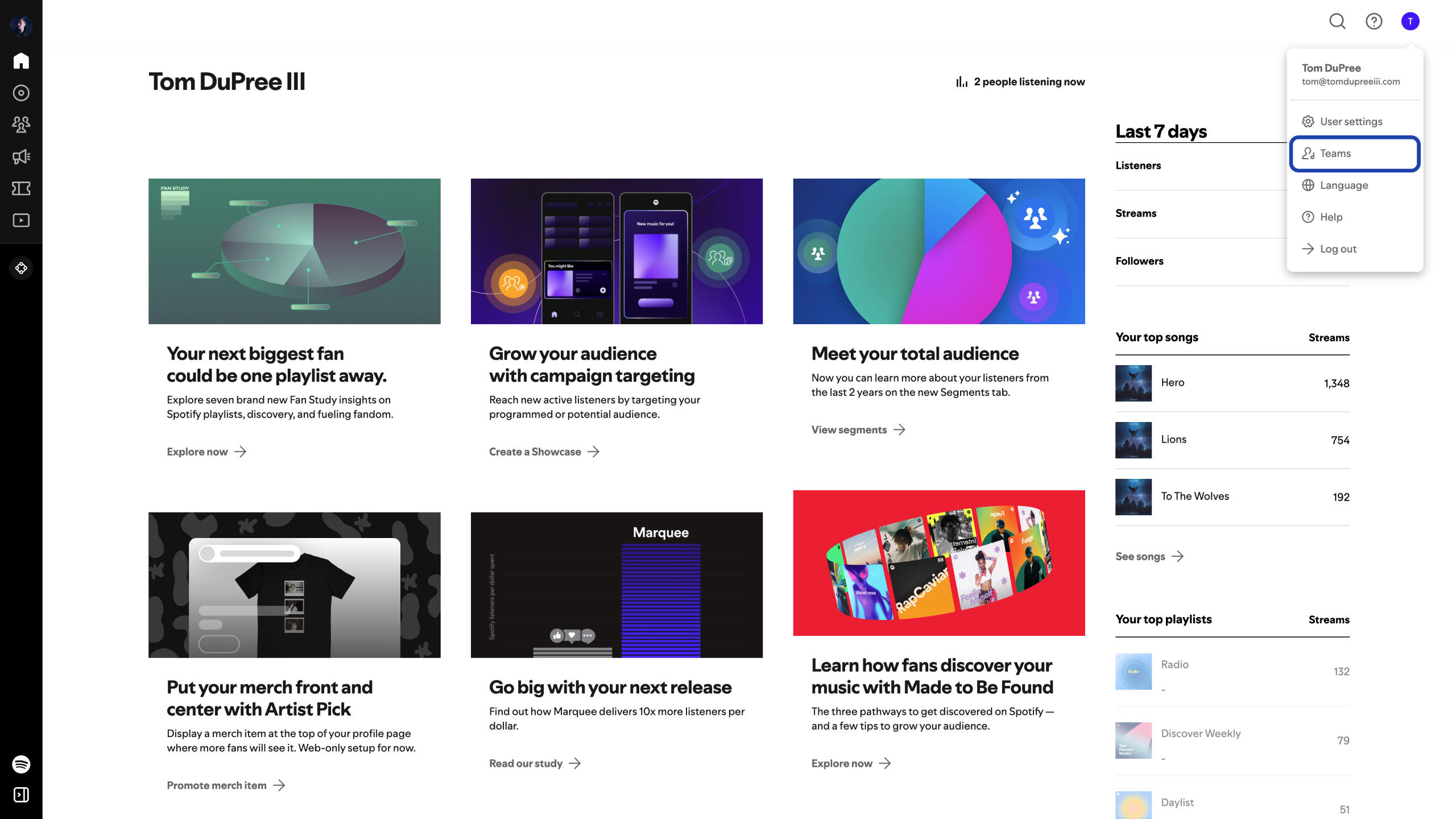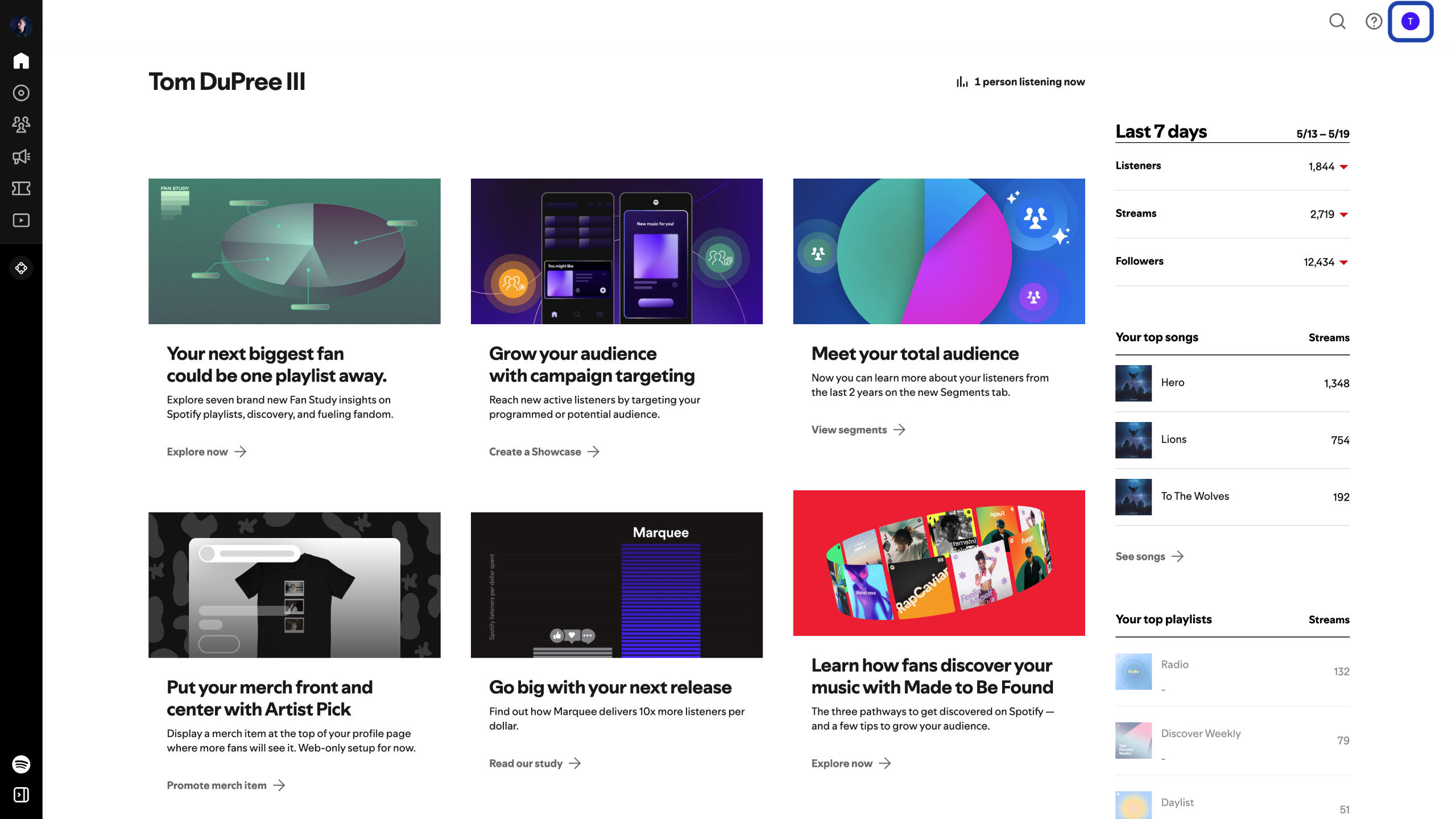 Visit Spotify for Artists and select the icon in the top right of the screen.