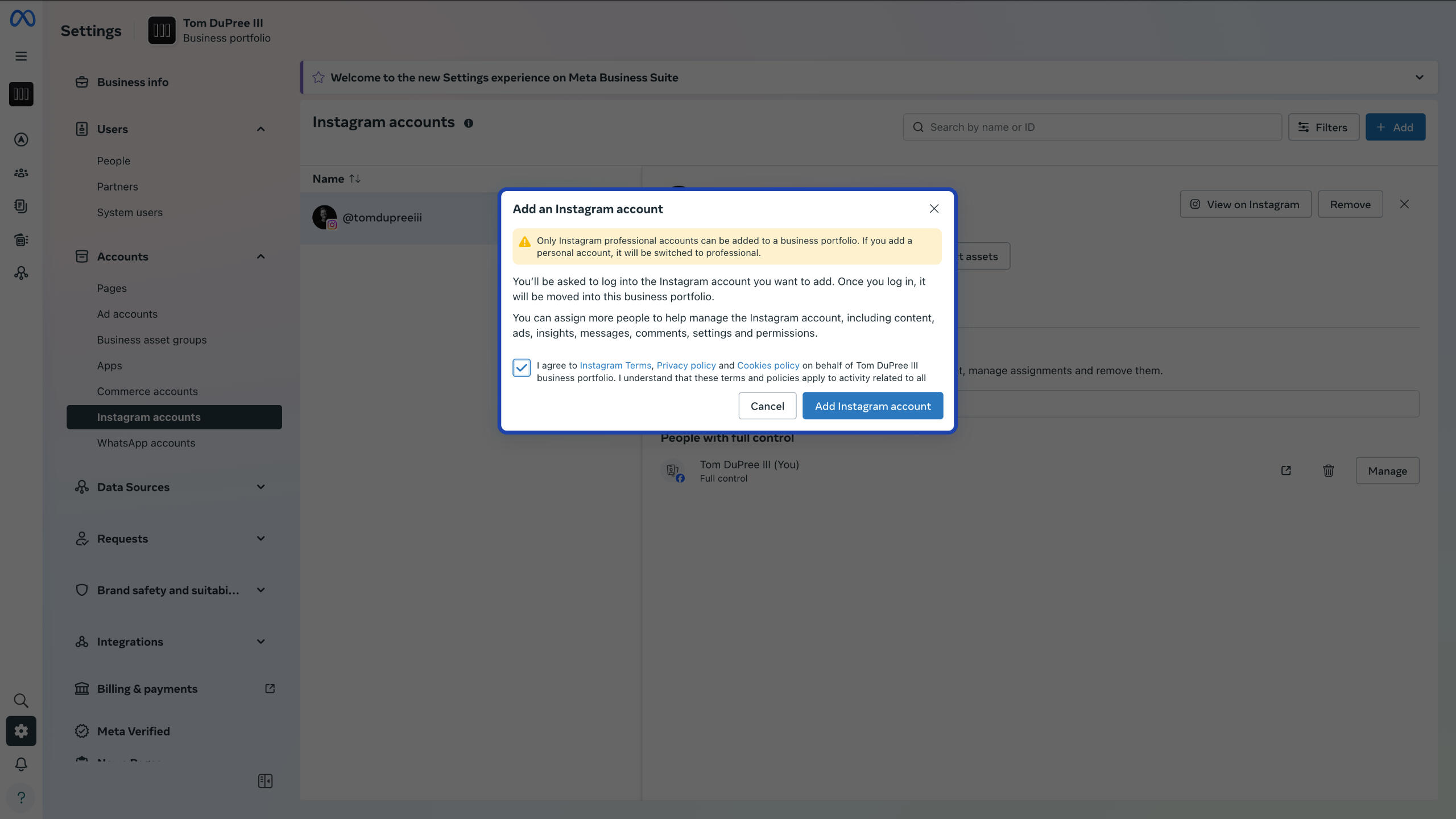 Select “Add an Instagram Account”, then input your information to log in and connect your account to your Meta Business Portfolio.