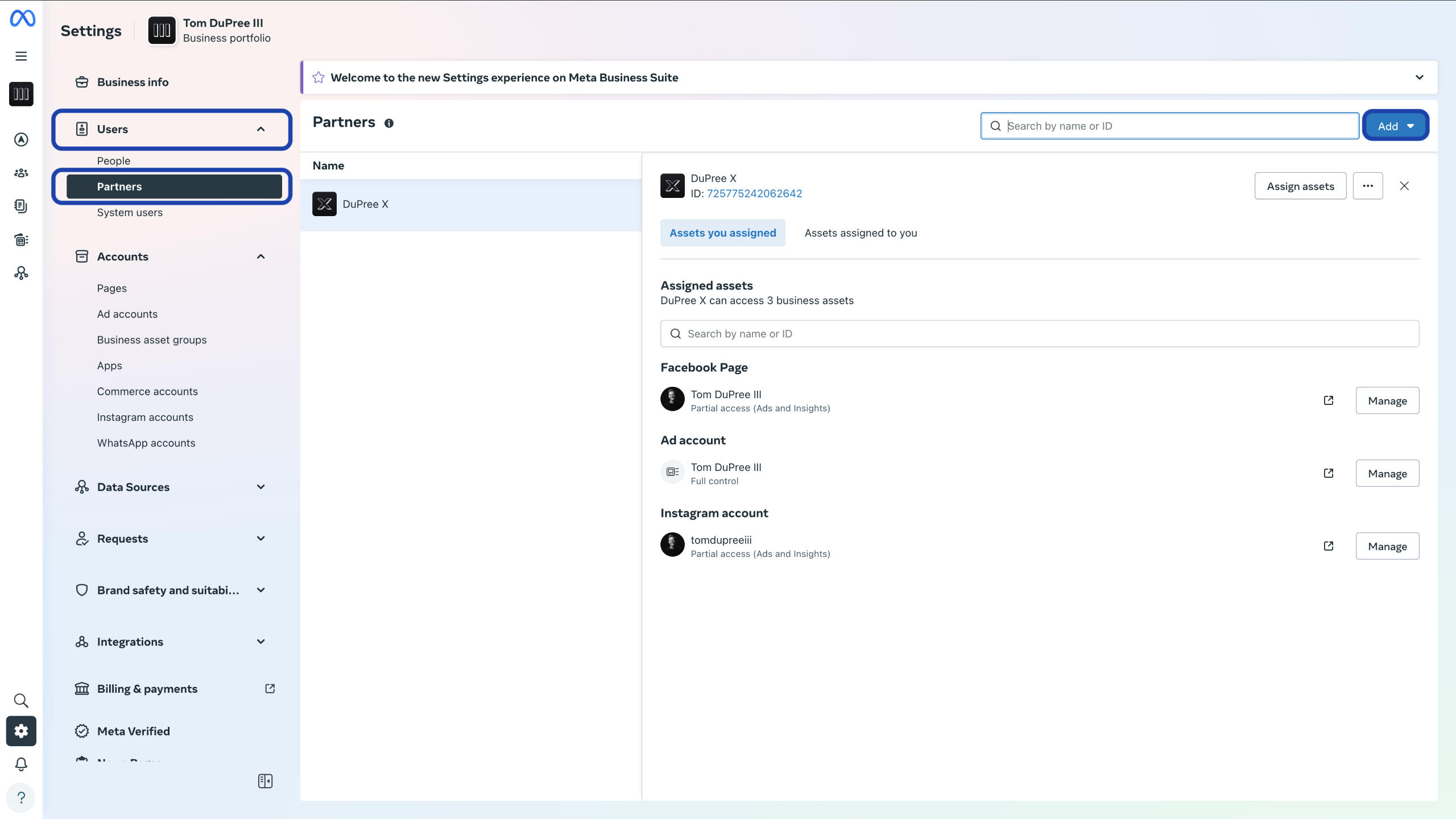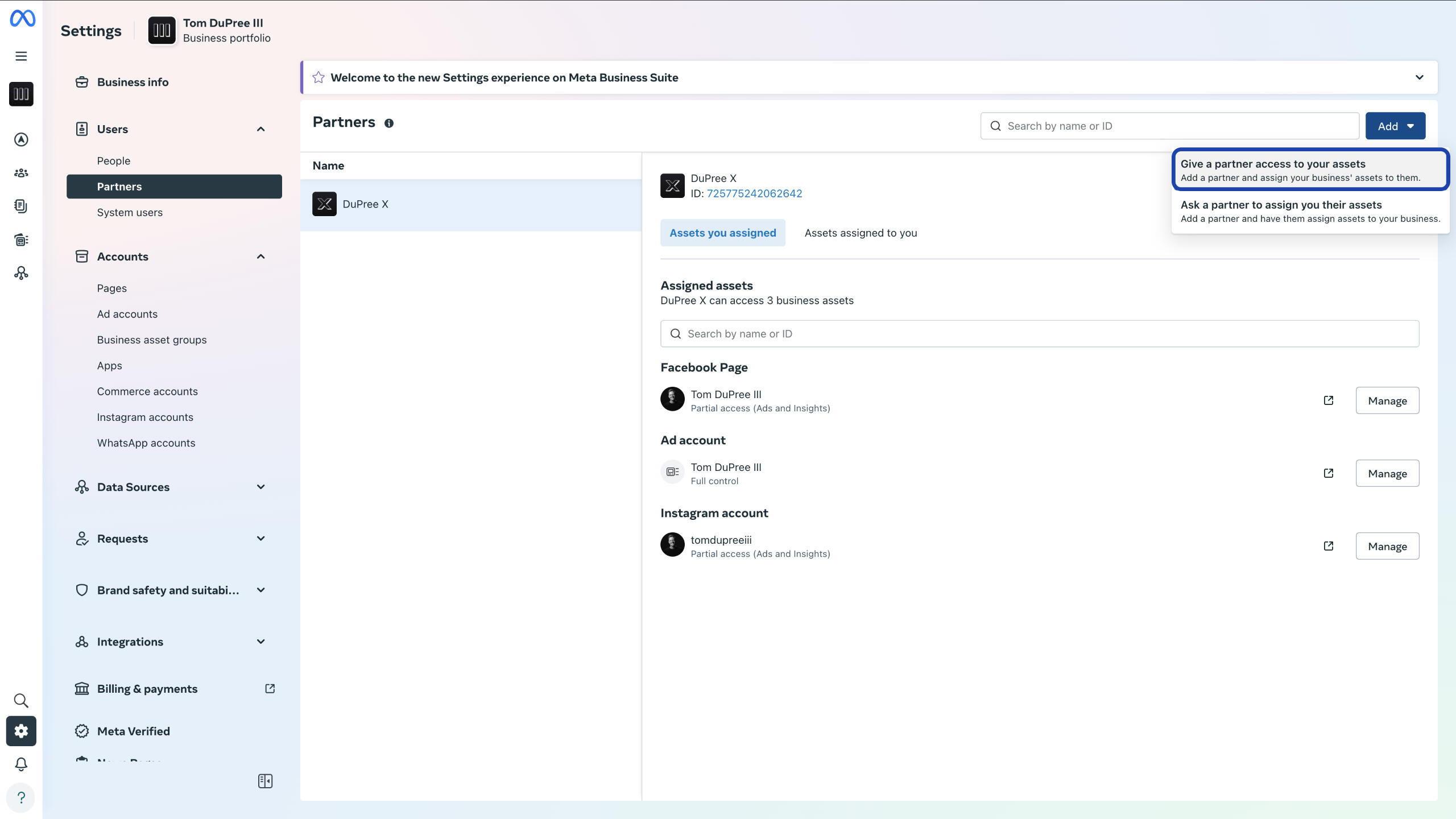 Navigate to the Partners tab in your Business Portfolio settings and select the blue “Add” button from the top right of the screen.