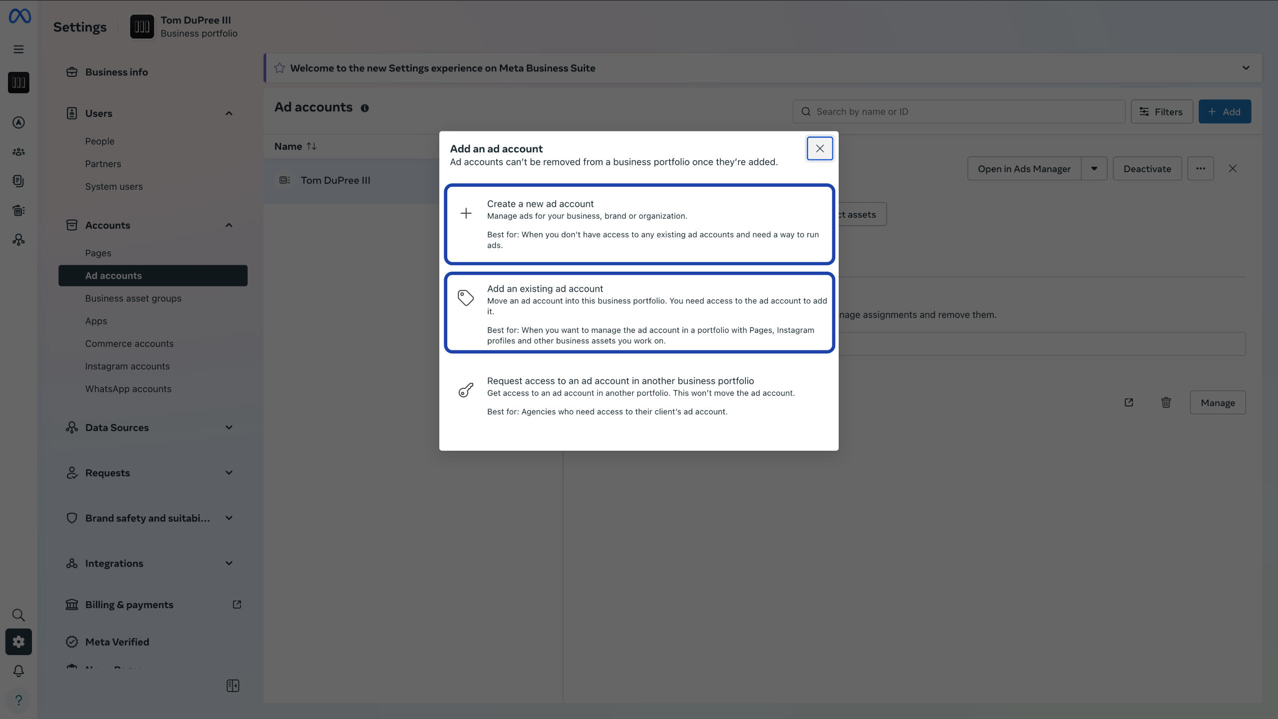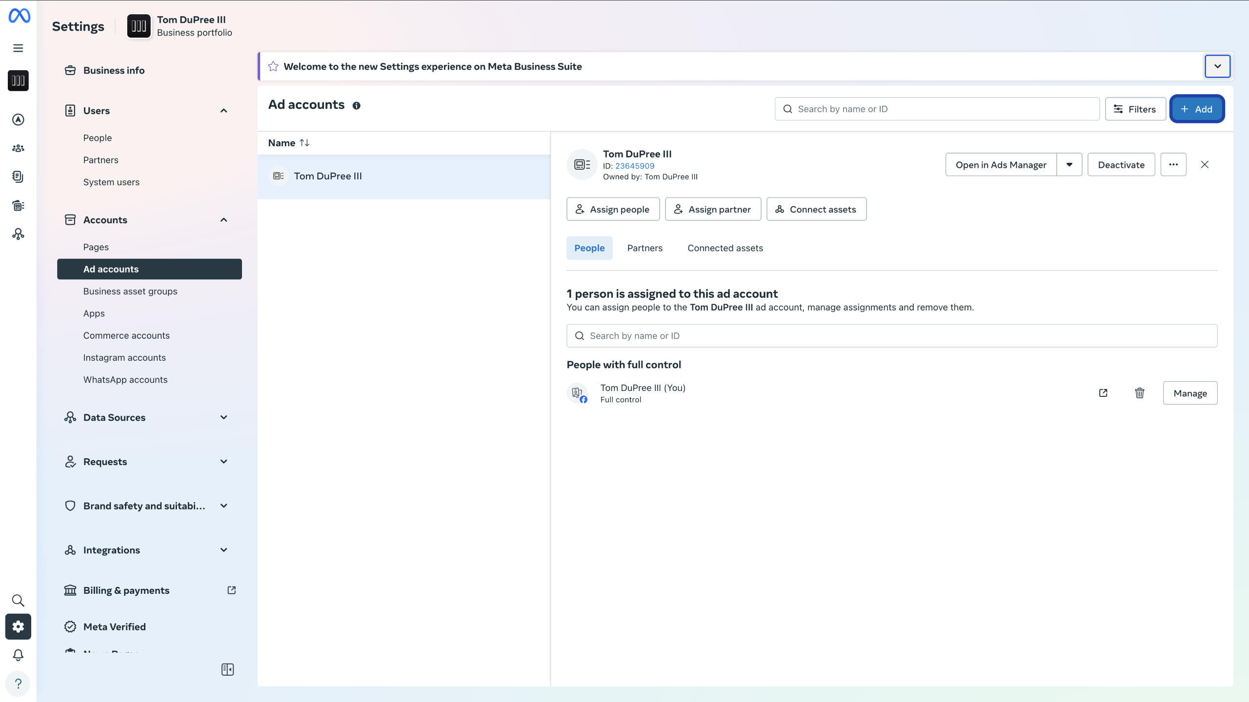 Once you have pasted your ad account ID, select "Add ad account" to connect your ad account to your Business Portfolio. Once your ad account is connected, it is ready to share.