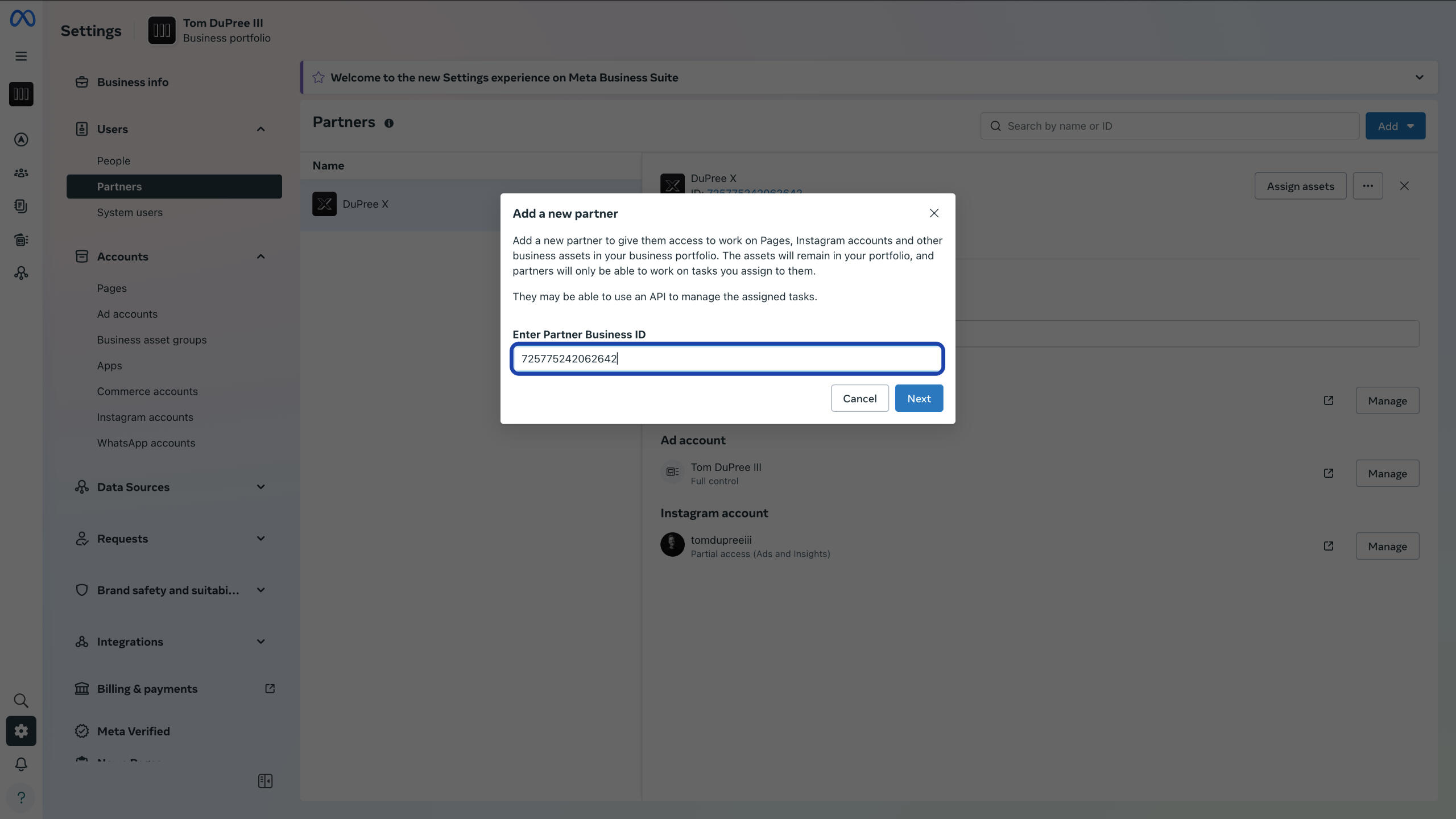 Paste the DuPree X Business Manager ID into the field—725775242062642—and select “Next”.