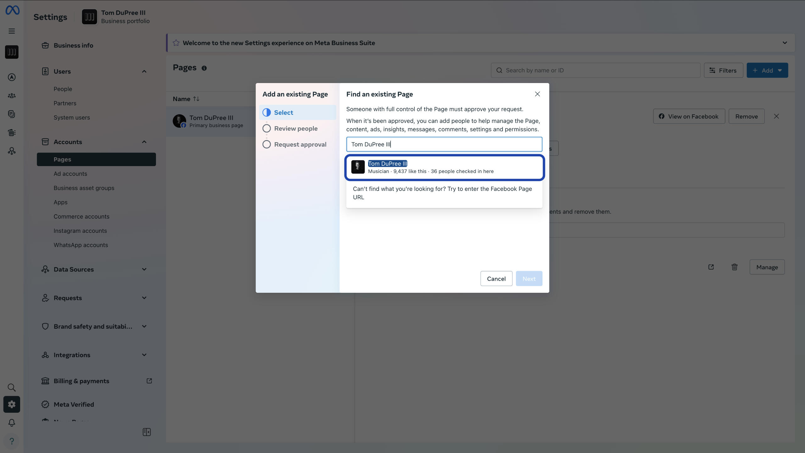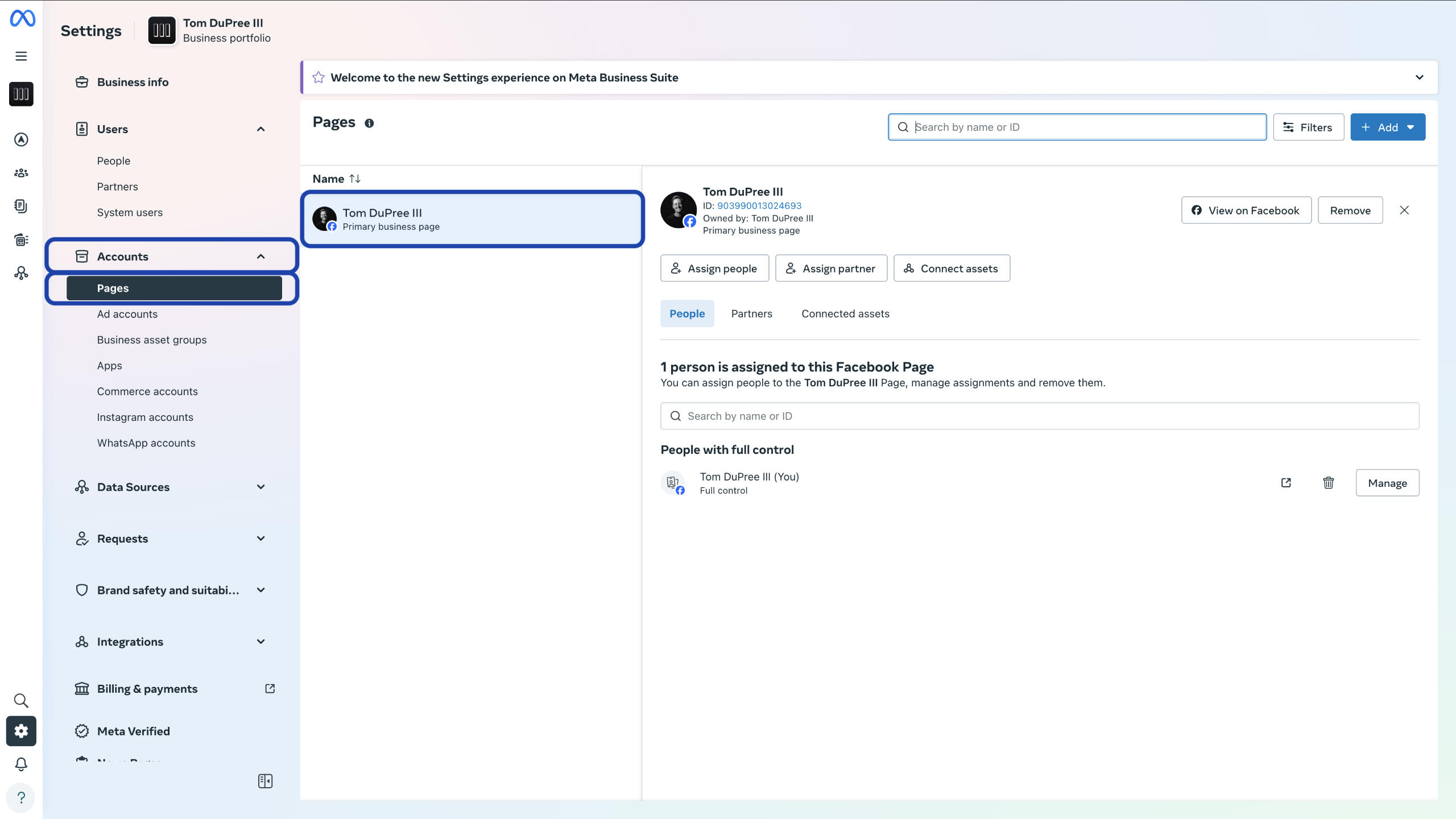 In the Settings menu, select “Accounts” and “Pages” from the left panel. If you see your page, then it is correctly connected to your Business Portfolio and ready to share.