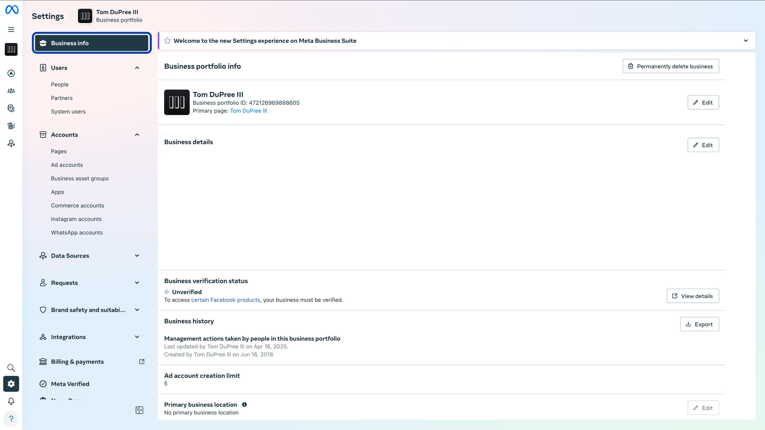 Navigate to "Business info" at the bottom of the left column in Business Settings.