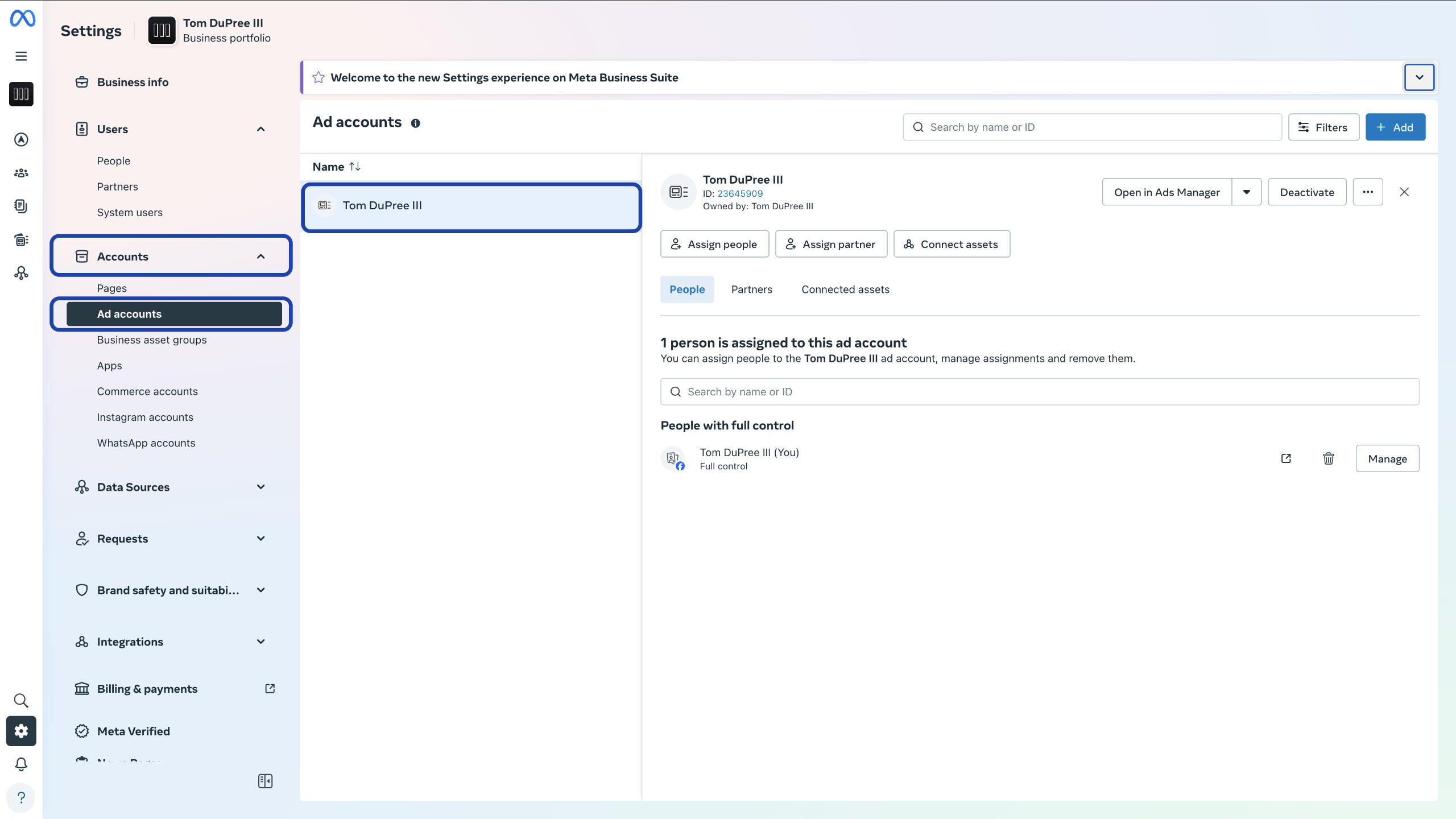 Select “Accounts” and “Ad accounts” from the left panel. If you see your account here, then it is already connected to your Business Portfolio.