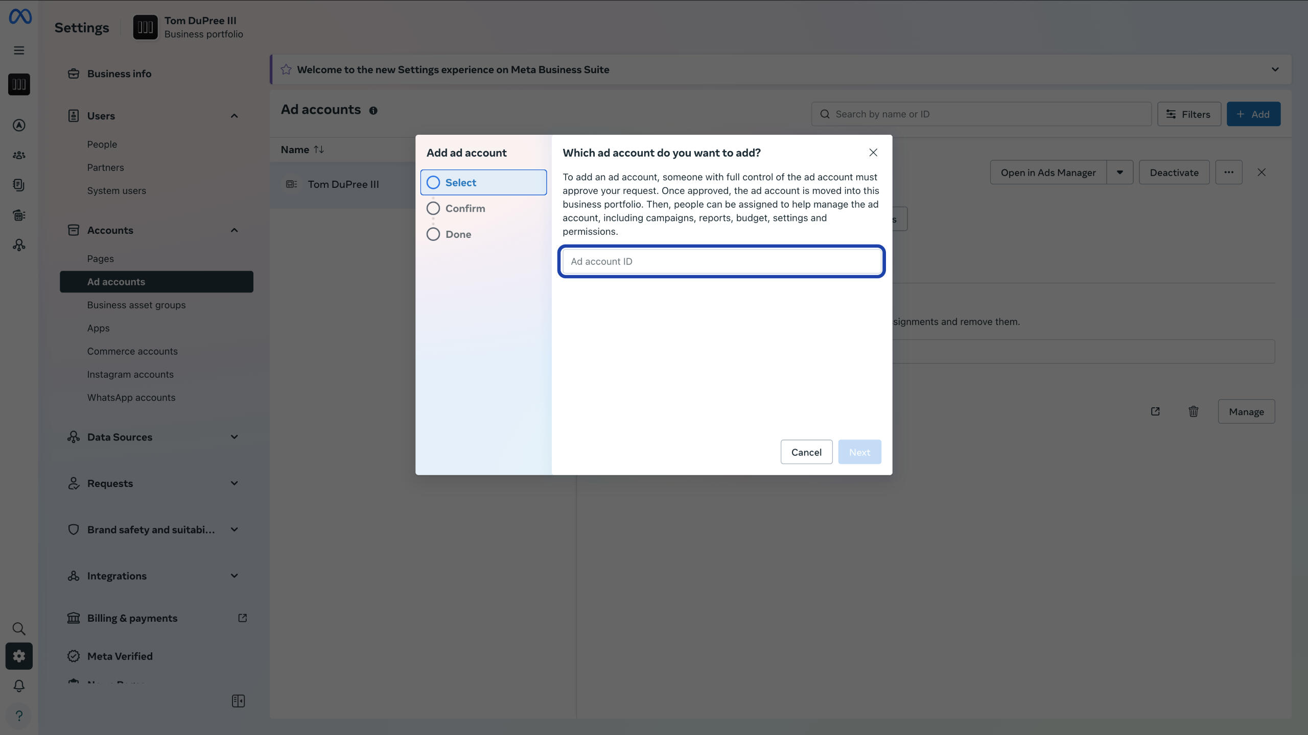 Paste the DuPree X Business Manager ID into the field—725775242062642—and select “Next”.